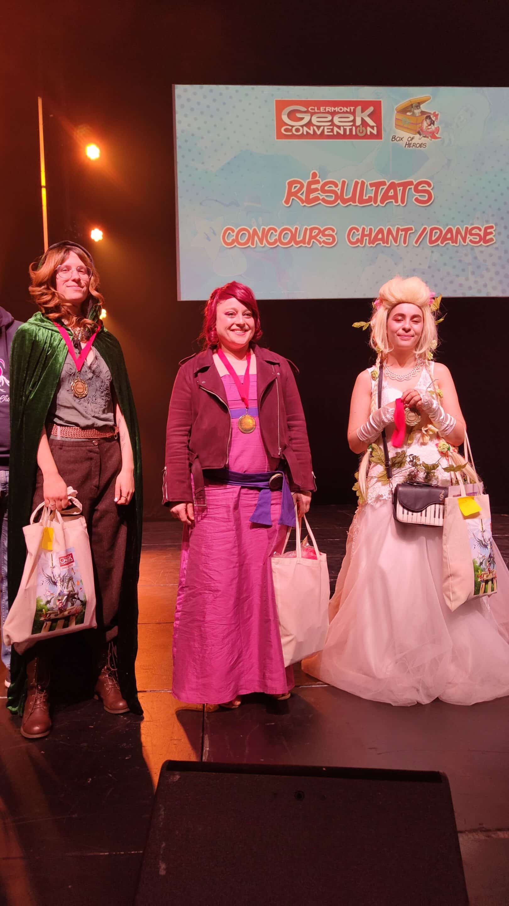 Ce samedi 15 mars sur la grande scène de la Clermont Geek Convention 2025, se tenait le concours chant/danse organisé par Box of Heroes. Six prix étaient disponibles : 1er, 2eme et 3eme places pour chaque catégorie :